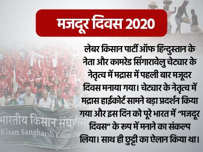 लेबर किसान पार्टी ऑफ हिन्दुस्तान के नेता और कामरेड सिंगारावेलु चेट्यार के नेतृत्व में मद्रास में पहली बार मजूदर दिवस मनाया गया। चेट्यार के नेतृत्व में मद्रास हाईकोर्ट सामने बड़ा प्रदर्शन किया गया और इस दिन को पूरे भारत में “मजदूर दिवस” के रूप में मनाने का संकल्प लिया। साथ ही छुट्टी का ऐलान किया था।