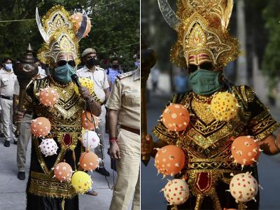 यमराज की वेशभूषा वाले शख्स ने संदेश दिया कि कोरोना यमराज का दूत है और जो लोग लॉकडाउन का उल्लंघन करेंगे, उन्हें यह कोरोना रूपी दूत यमलोक ले जाएगा।