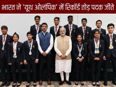 यूथ ओलम्पिक में भारत ने रचा इतिहास। विजेताओं के साथ प्रधानमंत्री नरेंद्र मोदी और केंद्रीय मंत्री राज्यवर्धन सिंह राठौर।