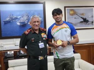 1 / 8भारत के स्टार भाला फेंक खिलाड़ी नीरज चोपड़ा को ओलंपिक में पहले एथलेटिक्स स्वर्ण पदक पाने के भारत के इंतजार को खत्म करके इतिहास रचने को लेकर भारतीय सेना में प्रोन्नति मिलने की संभावना है।2 / 8चीफ ऑफ डिफेंस स्टाफ जनरल बिपिन रावत ने स्वर्ण पदक विजेता भाला फेंक खिलाड़ी सूबेदार नीरज चोपड़ा की सराहना की। टोक्यो ओलंपिक में नीरज चोपड़ा के प्रदर्शन के लिए बधाई दी, जिसने देश को गौरवान्वित किया।3 / 8सेना प्रमुख जनरल एमएम नरवणे ने सूबेदार नीरज चोपड़ा के साथ बातचीत की और टोक्यो ओलंपिक में भाला फेंक में स्वर्ण पदक जीतने के लिए उनकी सराहना की। उन्होंने चोपड़ा के परिवार के सदस्यों को भी उनके प्रदर्शन के लिए बधाई दी।4 / 8भारतीय सेना में चार राजपूताना राइफल्स के सूबेदार चोपड़ा को उनकी शानदार खेलकूद प्रतिभा को लेकर प्रतिष्ठित विशिष्ठ सेवा पदक प्रदान किया गया है। हरियाणा के पानीपत जिले के खांद्रा गांव के एक किसान के बेटे 23 वर्षीय नीरज ने अपने दूसरे प्रयास में 87.58 मीटर भाला फेंककर दुनिया को स्तब्ध कर दिया और भारतीयों को जश्न में डुबा दिया।5 / 8एथलेटिक्स में पिछले 100 वर्षों से अधिक समय में भारत का यह पहला ओलंपिक पदक है। सेना में संबधित विषय के जानकारों ने बताया कि सूबेदार चोपड़ा को टोक्यो ओलंपिक्स में उनके शानदार प्रदर्शन को लेकर निर्धारित नियमों एवं प्रक्रियाओं के तहत प्रोन्नति मिलेगी। रक्षा मंत्री एवं सशस्त्र बलों ने इन सैन्यकर्मी की यह कहते हुए तारीफ की थी कि उन्होंने ‘सच्चे सैनिक’ की भांति प्रदर्शन करके देश को गौरवान्वित किया है। चोपड़ा, 15 मई, 2016 को नायब सूबेदार के तौर पर चार राजपूताना राइफल्स में शामिल हुए थे।6 / 8टोक्यो ओलंपिक में स्वर्ण पदक जीतकर इतिहास रचने वाले भारतीय भाला फेंक खिलाड़ी नीरज चोपड़ा ने कहा कि वह खेल में अपना अभ्यास जारी रखेंगे और अपने ऊपर सुपर स्टार वाली सोच (सफलता का खुमार) कभी हावी नहीं होने देंगे। खिलाड़ी के लिए ऐसी मानसिकता होना खतरनाक है और उनका पूरा ध्यान खेल पर ही रहेगा। चोपड़ा से जब पूछा गया कि इस वक्त आपके प्रशंसकों की संख्या (फैन फॉलोइंग) किसी फिल्मी सितारे से कम नहीं है, खासकर लड़कियों में, तो उन्होंने कहा, ‘‘ देखिए ये अच्छी बात है...लेकिन मैं सबसे ज्यादा ध्यान खेल पर रखना चाहता हूं , मैं अपना पूरा ध्यान खेल पर रखना चाहता हूं।’’7 / 8पेरिस ओलंपिक के बारे में पूछे गये सवाल पर कहा, ‘‘ वह उसी समय देखेंगे, उसके बारे में उसी समय पता चलेगा लेकिन मैं अपनी तरफ से उसके लिए पूरी मेहनत करूंगा, और इस चीज से थोड़ी कोशिश करूंगा..जैसा आपने कहा कि सुपरस्टार वाली सोच वो थोड़ा न ही आए तो अच्छा रहेगा ’’ उन्होंने खेलों में ऐसी सोच को खतरनाक करार देते हुए कहा, ‘‘ बस अपनी ट्रेनिंग अच्छे से करुं