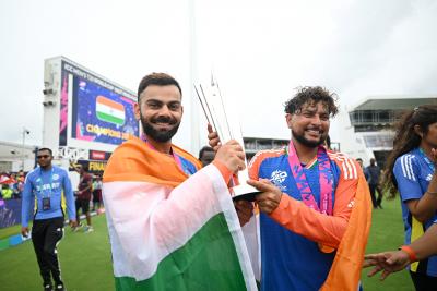 ट्रॉफी के साथ भारतीय टीम के विराट बल्लेबाज कोहली और स्पिन के जादुगर कुलदीप यादव।