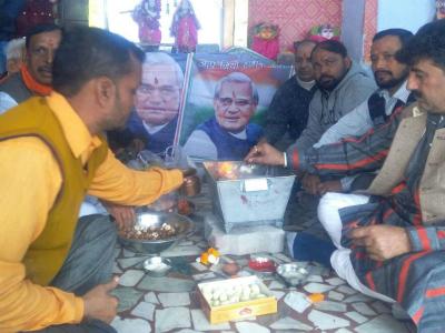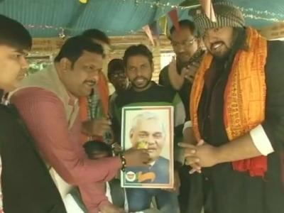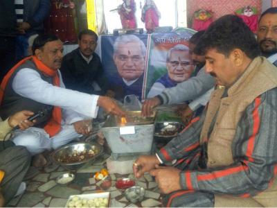 कार्यकर्ताओं ने वहां अटल बिहारी वाजपेयी की तस्वीर रखकर केक काटा।