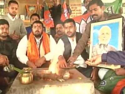 वहां पीएम मोदी की एक तस्वीर को सामने रखकर कार्यकर्ता मंत्रोच्चार के साथ हवन कर रहे हैं।