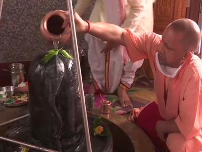 सीएम योगी के पूजा की तस्वीरें भी सामने आई हैं। वे सुबह ही मंदिर पहुंचे थे और भगवान शिव का जलाभिषेक किया। (फोटो: ANI)
