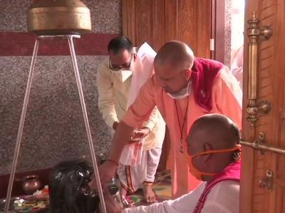 योगी आदित्यनाथ ने गोरखपुर में मानसरोवर मंदिर में विधिवत पूजा-पाठ किया और जल चढ़ाया। (फोटो: ANI)