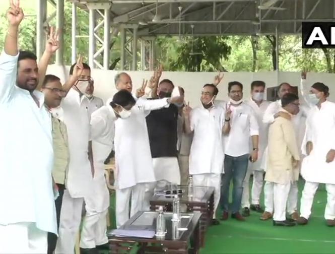 राजस्थान में अशोक गहलोत सरकार पर मंडरा रहा खतरा अब टलता दिख रहा है, क्योंकि सोमवार को मुख्यमंत्री आवास पर हुई बैठक में 100 से अधिक विधायकों ने हिस्सा लिया और विक्ट्री साइन दिखाकर साफ किया है सीएम अशोक गहलोत के पास बहुमत है।