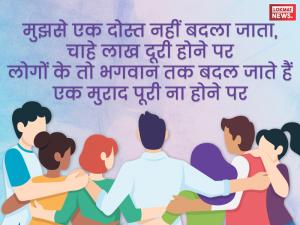 1 / 8 मुझसे एक दोस्त नहीं बदला जाता, चाहे लाख दूरी होने पर लोगों के तो भगवान तक बदल जाते हैं एक मुराद पूरी ना होने पर2 / 8दोस्तों की दोस्ती में कभी कोई रूल नहीं होता है और ये सिखाने के लिए, कोई स्कूल नहीं होता है3 / 8दोस्ती में ना कोई वार, ना कोई दिन होता हैं, ये तो वो एहसास है जिसमे बस यार होता हैं|4 / 8दोस्त दिल की हर बात समझ जाया करते हैं सुख दुःख के हर पल में साथ हुआ करते है दोस्त तो मिला करते है तक़दीर वालो को मिले ऐसी तक़दीर हर बार हम दुआ करते है5 / 8जमाने से कब के गुजर गए होते, ठोकर ना लगी होती बच गए होते, बंधे थे बस दोस्ती के धागों में, वरना कब के बिखर गए होते।6 / 8आसमान हमसे अब नाराज है, तारों का गुस्सा बेहिसाब हैं, वो सब हमसे जलते है क्योंकि, चाँद से बेहतर दोस्त हमारे पास हैं।7 / 8तेरी मुस्कराहट मेरी पहचान थी, तेरी ख़ुशी मेरी साँस थी, कुछ भी नहीं तेरे बिना मेरी जिंदगी में, बस इतना समझ ले, तेरी दोस्ती ही मेरी जान थी।8 / 8ज़िन्दगी हर पल खास नहीं होती, फूलों की खुशबू हमेशा पास नहीं होती, मिलना हमारी तकदीर में लिखा था वरना, इतनी प्यारी दोस्ती कभी इतेफाक नहीं होती।