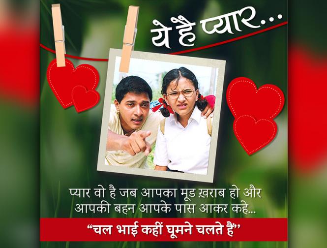 प्यार वो है जब आपका मूड ख़राब हो और आपकी बहन आपके पास आकर कहे... "चल भाई कहीं घूमने चलते हैं''