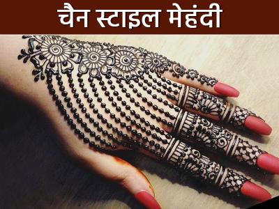 3) चैन स्टाइल मेहंदी: ब्रेसलेट कह लें या फिर चैन स्टाइल, इस मेहंदी को लगवाने का आजकल ट्रेंड बन गया है। इस स्टाइल में आपको कई तरीके मिल जाएंगे। आप खुद ही तस्वीर में 4 डिजाइन देख सकती हैं। कोई भी एक चुन लें।