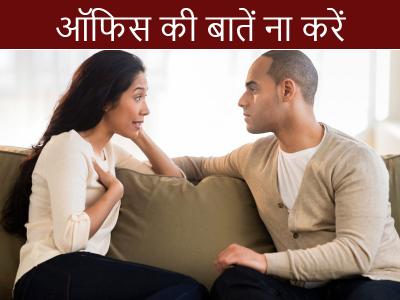 1) ऑफिस की बातें ना करें: पति-पत्नी अगर दोनों वर्किंग हैहैं तो जाहिर है कि दिन में अंत में एक दूसरे के ऑफिस की बातें शेयर करते होंगे। अगर आप ऐसा करते हैं तो जरूर करें, मगर खाने के टेबल तक। इसके बाद बेड पर आने तक इन बातों को ख़त्म कर दें। क्यूंकि ये दोनों के बीच स्ट्रेस को बढ़ाती हैं।