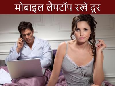 3) मोबाइल लैपटॉप रखें दूर: रात को हर काम ख़त्म करने के बाद कमरे में आपका पूरा समय अपने पार्टनर के लिए होना चाहिए। उससे बात करें, उसकी जरूरतों को समझें, एक दूसरे के बीच इमोशनल और शारीरिक निकटता लाएं और मोबाइल-लैपटॉप जैसी रुकावटों को कमरे से बाहर रखें।