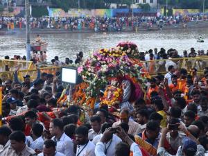 1 / 7श्रावण के तीसरे सोमवार पर भगवान महाकालेश्वर की तीसरी सवारी मंदिर से निकाली गई। सवारी में रजत पालकी में भगवान श्री चन्द्रमोलेश्वर रूप में, हाथी पर श्री मनमहेश के स्वरूप में व बैलगाड़ी में गरुड़ रथ पर श्री शिवतांडव स्वरूप में नगर भ्रमण पर निकले।2 / 7इससे पूर्व मंदिर के सभामंडप में मुख्यमंत्री शिवराज सिंह चौहान ने सपरिवार भगवान के श्री चन्द्रमोलेश्वर स्वरूप का पूजन-अर्चन किया। चौहान सवारी में पैदल चले और जनअभिवादन स्वीकार किया। सर्व प्रथम भगवान श्री महाकालेश्वर का षोडशोपचार से पूजन-अर्चन किया गया। मुख्यमंत्री शिवराज सिंह चौहान ने सपरिवार सभा मंडप में भगवान चंद्रमौलेश्वर का विधि विधान से पूजन किया।3 / 7पूजन पंडित घनश्याम शर्मा द्वारा करवाया गया। भगवान की आरती की गई।इसके उपरांत भगवान के चंद्रमौलेश्वर रूप को रजत पालकी में सवार कर गणमान्यजनों ने पालकी को कांधा देकर नगर भ्रमण की ओर रवाना किया।4 / 7सवारी से पूर्व दोपहर में उज्जैन पहुंचे मुख्यमंत्री ने सपरिवार गृर्भगृह में धर्मपत्नी साधना सिंह एवं पुत्र कार्तिकेय एवं कुणाल के साथ भगवान श्री महाकालेश्वर का अभिषेक कर सबके कल्याण, स्वास्थ्य, सभी सुखमय रहे इस हेतु से संपूर्ण सृष्टि के कल्याण के साथ-साथ जीव चराचर के कल्याण की कामना की।5 / 7 पूजन पुजारी अभिषेक शर्मा(बाला गुरु), पुरोहित सुभाष शर्मा ने संपन्न करवाई।सवारी के दौरान मुख्यमंत्री पालकी के घेरे में सपरिवार चल रहे थे।इस दौरान उन्होंने श्रद्धालुओं का अभिवादन स्वीकार किया।सवारी परंपरागत मार्ग से रामघाट पहुंची यहां मुख्यमंत्री ने सपत्नीक भगवान का शिप्रा जल से अभिषेक कर पूजन अर्चन किया।6 / 7रामघाट से सवारी ढाबा रोड होती श्री गोपाल मंदिर पहुंची। यहां पर भगवान का सिंधिया परिवार की और से परंपरागत पूजन मंदिर के पूजारियों ने किया। इसके बाद सवारी पटनी बाजार,गुदरी,महाकाल चौराहा से होती हुई मंदिर पहुंची।7 / 7एएसपी आकाश भूरिया ने बताया कि तीसरी सवारी के दौरान सुरक्षा बतौर पुलिस ने आसमान से तीन ड्रोन उड़ाकर से पूरे समय सवारी एवं पालकी पर नजर रखी।इसके साथ ही करीब एक हजार पुलिस कर्मी एवं अधिकारी का फोर्स सवारी मार्ग एवं विभिन्न स्थलों पर तैनात किया गया था।नगर सुरक्षा समिति के तीन सौ से अधिक सदस्यों को भी विभिन्न् स्थलों पर श्रद्धालुओं की सुरक्षा व्यवस्था में लगाया गया था। (सभी फोटो लोकमत)