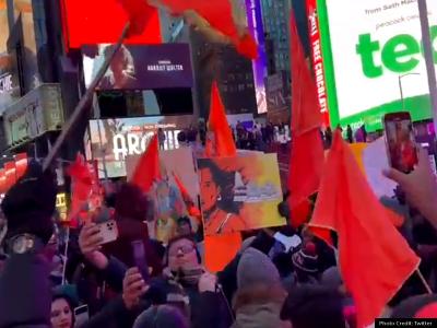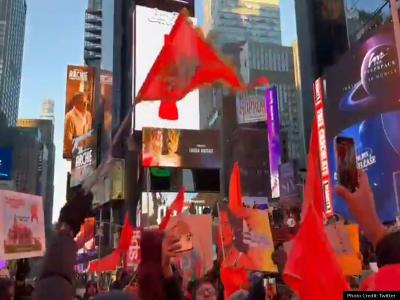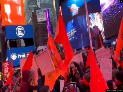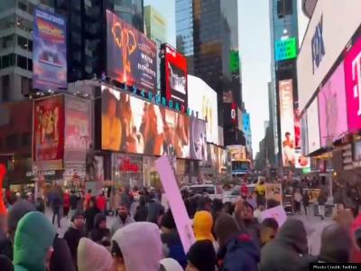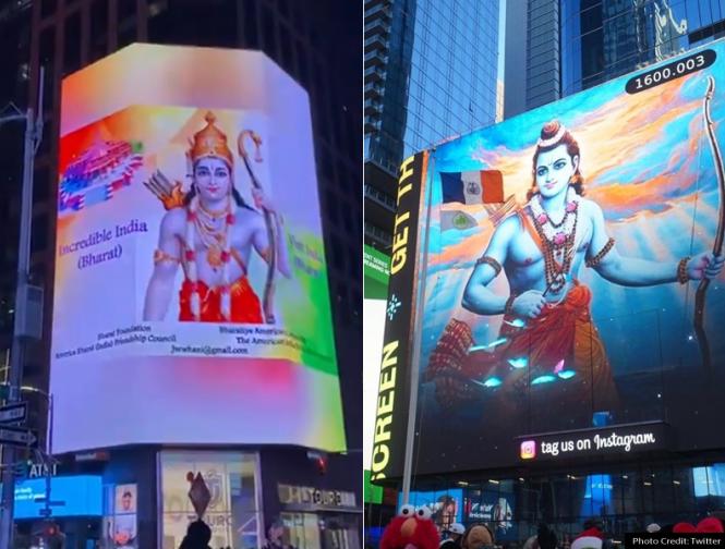 न्यूयॉर्क टाइम्स स्क्वायर पर राम भक्तों की भीड़ नजर आई, हर जगह श्री राम के झंडें और बिल्डिंग पर राम वीडियो नजर आईं।