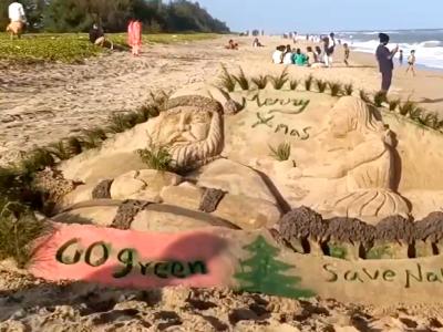 तमिलनाडु: क्रिसमस के अवसर पर रेत कलाकार ने चेंगलपट्टू ज़िले के मामल्लापुरम के पास रेत से सांता क्लॉज़ की कलाकृति बनाई।
