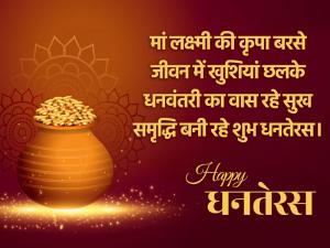 1 / 8मां लक्ष्मी की कृपा बरसे जीवन में खुशियां छलके धनवंतरी का वास रहे सुख समृद्धि बनी रहे शुभ धनतेरस।2 / 8धनतेरस का शुभ दिन आया सबके लिए नई खुशियां लाया लक्ष्मी-गणेश विराजे घर में सदा रहे सुखों की छाया। शुभ धनतेरस3 / 8दीप जले तो रोशन आपका जहान हो, पूरा आपका हर एक अरमान हो, मां लक्ष्मी जी की कृपा बनी रहे आप पर, इस धनतेरस पर आप बहुत धनवान हों। शुभ धनतेरस।4 / 8इस धनतेरस कुछ खास हो, दिलों में खुशियां, घर में सुख का वास हो; हीरे-मोती से सजा आपका ताज हो, मिट जाएं दूरियां सब आपके पास हो; ऐसा धनतेरस आपका खास हो शुभ धनतेरस।5 / 8सोने का रथ, चांदी की पालकी, बैठकर जिसमें है मां लक्ष्मी आई, देने आपको और आपके पूरे परिवार को, धनतेरस की बधाई।6 / 8दिनों दिन बढ़ता जाए आपका कारोबार, परिवार में बना रहे स्नेह और प्यार होती रहे हमेशा अपार धन की बौछार ऐसा हो आपका धनतेरस का त्योहार शुभ धनतेरस।7 / 8धन धान्य भरी है धनतेरस, धनतेरस का दिन है बड़ा ही मुबारक, माता लक्ष्मी है इस दिन की संचालक, आओ मिल करें पूजन उनका, जो हैं जीवन की उद्धारक।8 / 8जीवन में हर ऊंचाई प्राप्त करो आप, सदा अपनों के साथ रहो आप, लक्ष्मी मां अपनी कृपा रखे आप पर और हमेशा खुशहाल रहो आप।