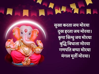 8. सुखा करता जय मोरया दुख हरता जय मोरया। कृपा सिन्धु जय मोरया बुद्धि विधाता मोरया गणपति बप्पा मोरया मंगल मूर्ती मोरया।