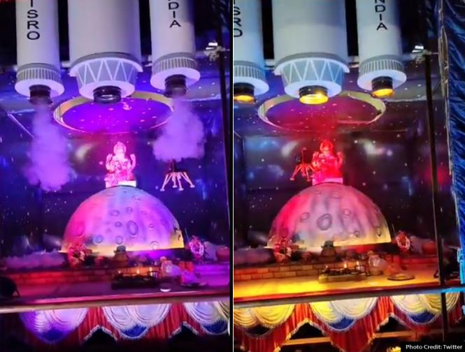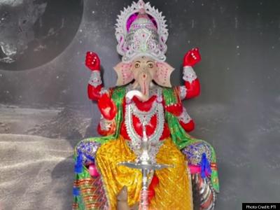 Ganesh Pandal in Kolkata: कोलकाता में चंद्रयान-थीम पर भगवान गणेश की प्रतिमा को चंद्रमा की सतह पर दिखाया गया साथ ही कुछ दूरी पर पृथ्वी भी दिखाई गई है।