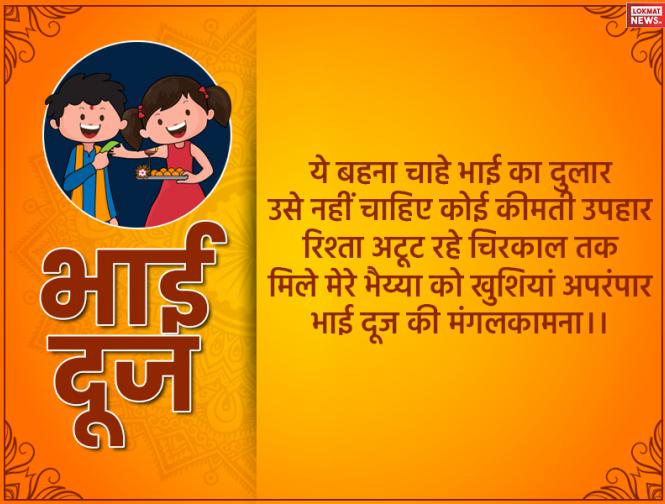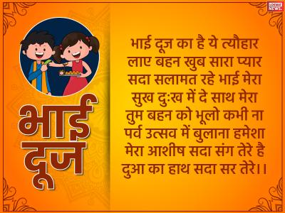 भाई दूज का है ये त्यौहार लाए बहन खुब सारा प्यार सदा सलामत रहे भाई मेरा सुख दुःख में दे साथ मेरा तुम बहन को भूलो कभी ना पर्व उत्सव में बुलाना हमेशा मेरा आशीष सदा संग तेरे है दुआ का हाथ सदा सर तेरे।।