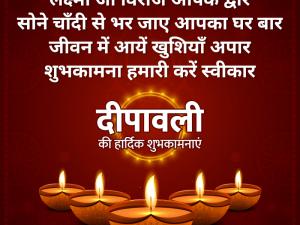 1 / 7लक्ष्मी जी विराजें आपके द्वार, सोने चाँदी से भर जाए आपका घर बार, जीवन में आयें ख़ुशियाँ अपार, शुभकामना हमारी करें स्वीकार।2 / 7दीए की रोशनी से सब अन्धेरा दूर हो जाए दुआ है कि आप जो चाहो वो सब खुशी मंज़ूर हो जाए दिवाली की हार्दिक शुभकामनाएँ।3 / 7टिमटिमाएंगे दीये, घर में होगा महालक्ष्मी का वास, आज का दिन आपके लिए हो बेहद खास।4 / 7सागर भरी खुशियां, आसमान भरा प्यार, मिठाई की खुशबू, दीपों की बहार, जमकर मनाइये दिवाली का त्यौहार।5 / 7दीपक का प्रकाश हर पल आपके जीवन में, नई रोशनी लाए, बस यही शुभकामना है आपके लिए इस दीपावली में।6 / 7सुख के दीपक जले, घर आंगन में खुशहाली हो, बड़ों का आशीर्वाद और अपनों का प्यार मिले, ऐसी आपकी मंगल दिवाली हो।7 / 7दीयों की रोशनी से झिलमिलाता आंगन हो, पटाखों की गूंजों से आसमान रोशन हो, ऐसी आये झूम के ये दीवाली, हर तरफ खुशियों का मौसम हो।