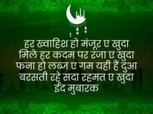 1 / 7हर ख्वाहिश हो मंजूर ए खुदा मिले हर कदम पर रजा ए खुदा फना हो लब्ज ए गम यही हैं दुआ बरसती रहे सदा रहमत ए खुदा ईद मुबारक2 / 7ये दुआ मांगते हैं हम ईद के दिन बाकी न रहे आपका कोई गम ईद के दिन आपके आंगन में उतरे हर रोज खुशियों भरा चांद और महकता रहे फूलों का चमन ईद के दिन आप सभी को ईद मुबारक3 / 7ईद का त्यौहार आया है खुशियां अपने संग लाया है खुदा ने दुनिया को महकाया है देखो फिर से ईद का त्यौहार आया है आप सभी को दिल से ईद मुबारक4 / 7कोई इतना चाहे हमें तो बताना कोई तुम्हारी फ़िक्र करे तो बताना ईद मुबारक तो हर कोई कह देगा कोई हमारे अंदाज़ में कहे तो बताना दिल से ईद मुबारक5 / 7ऐ हवा तू ही उसे ईद-मुबारक कहियो और कहियो कि कोई याद किया करता है6 / 7ईद आई तुम न आए क्या मज़ा है ईद का ईद ही तो नाम है इक दूसरे की दीद का7 / 7दिए जलते और जगमगाते रहें हम आपको इसी तरह याद आते रहें जब तक ज़िंदगी है ये दुआ है हमारी आप ईद के चाँद की तरह जगमगाते रहें आप को ईद मुबारक