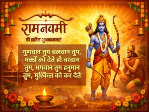 1 / 6इस भार देशभर में दो दिन रामनवमी मनाई जा रही है, ये दिन भगवान राम के जन्म का प्रतीक है, आप रामनवमी पर ये बधाई संदेश अपने दोस्तों और रिश्तेदारों को भेज सकते हैं। गुणवान तुम बलवान तुम, भक्तों को देते हो वरदान तुम, भगवान् तुम हनुमान तुम, मुश्किल को कर देते आसन तुम।2 / 6जिनके मन में श्री राम हैं, भाग्य में उसके वैकुंठ धाम है, उनके चरणों में जिसने जीवन वार दिया, संसार में उसका कल्याण है।3 / 6जिनका नाम राम है, अयोध्या जिनका धाम है, ऐसे रघुनंदन को हमारा दिल से प्रणाम है।4 / 6निकली है सज धज के राम जी की सवारी, लीला है सदा राम जी की न्यारी।5 / 6राम तो घर-घर में हैं, राम हर आँगन में हैं, मन से रावण जो निकाले, राम उसके मन में हैं।6 / 6नवमी तिथि मधुमास पुनीता, शुक्ल पक्ष अभीजीत नव प्रीता, मध्य दिवस अति शीत न घामा, पवन काल लोक विश्रामा।