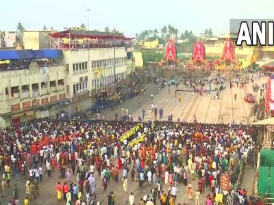 ओडिशा के पुरी में भगवान जगन्नाथ, उनके भाई बलभद्र और बहन देवी सुभद्रा के अलावा चक्रराज सुदर्शन के विशालकाय रथों के साथ शुक्रवार को नौ दिवसीय रथयात्रा उत्सव आरंभ हो गया। इस दौरान लाखों की संख्या में आए श्रद्धालुओं ने ‘जय जगन्नाथ’ और ‘हरिबोल’ का उद्घोष किया। घंटे, ढोल, मंजीरे और नगाड़ों की ध्वनि से आकाश गूंज उठा तथा सिंहद्वार के आसपास एकत्र हुए देशभर से आए श्रद्धालुओं ने रथों पर सवार देव प्रतिमाओं के दर्शन किये। (फोटो क्रेडिट - ANI)