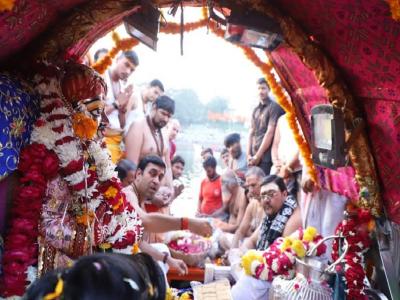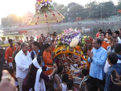 भगवान श्री महाकालेश्वर की पालकी माँ क्षिप्रा के तट पर पहुंचने पर बाबा महाकाल का माँ क्षिप्रा के जल से अभिषेक व पूजन अर्चन किया गया।