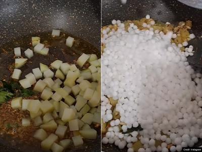 साथी ही सबकी फेवरेट साबूदाने की खिचड़ी तैयार करलें, सबसे पहले आप थोड़े से आलू के छोटे-छोटे टुकड़े और मूंगफली के दानों को तेल में फ्राई कर लें, इसके बाद अदरक के टुकड़े, हरी मिर्च और जीरा फ्राई कर लें, लास्ट में आप भीगा हुआ साबूदाना इसमें डालें और अच्छे में पका लें।