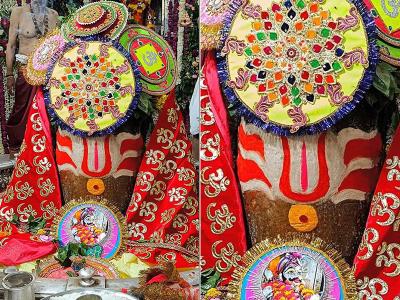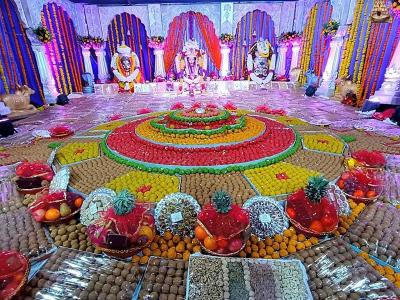 पुजारी यश गुरु ने बताया अभिषेक स्थल पर महल तैयार किया गया तो रंग-बिरंगी लाइटिंग के साथ ही यहां महाकाल के स्वरूप चांदी की प्रतिमाएं भी दर्शन हेतु रखी गई। गोल झांकी बनाने के लिए विशेष रूप से छोटे-बड़े लड्डू के थाल तैयार किए गए थे। वहीं लड्डू रंगीन भी बनवाए गए थे। साथ में फलों की टोकरी, ड्रायफ्रूटस व अन्य प्रकार की मिठाई भी पहली बार ही रखे गए। 25 क्विंटल बेसन, 20 क्विंटल घी से बने लड्डू, 45 लोग लगे।