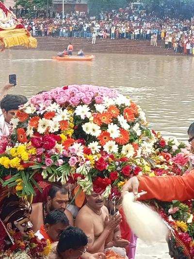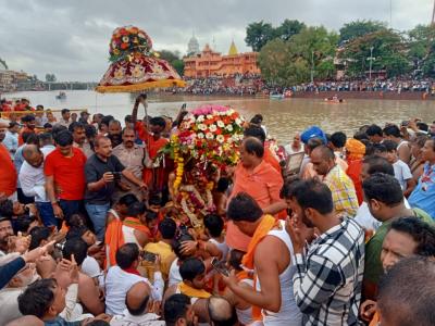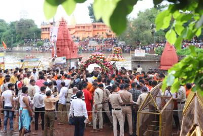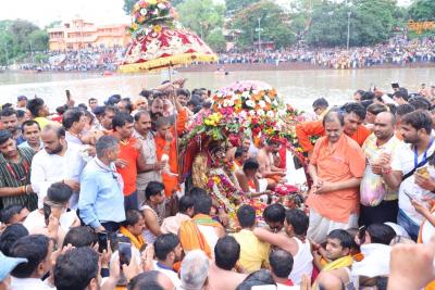 रिमझिम बारिश के बीच रामघाट पर विधि-विधान से बाबा महाकाल की पालकी का पूजन, मनमहेश का जलाभिषेक किया गया। जलाभिषेक के उपरांत पालकी श्री महाकालेश्वर मन्दिर के लिये रवाना हुई।