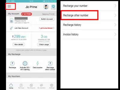 अब अगर आप माय जियो ऐप से अपने किसी दूसरे जियो नंबर को रिचार्ज कराना चाहते हैं तो माय जियो ऐप के बायीं तरफ दिए गए तीन डॉट पर क्लिक करना होगा। यहां आपको कई सारे ऑप्शन दिखेंगे। अब उनमें से रिचार्ज के ऑप्शन पर क्लिक करें।