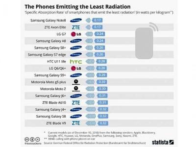 Statista द्वारा जारी किए गए रिपोर्ट के मुताबिक Xiaomi Mi A1 सबसे टॉप पर है। इसका रेडिएशन अब्जॉर्प्शन रेट (SAR) 1.74 वाट प्रति किलोग्राम है।