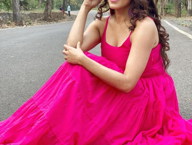 इस फोटोशूट में मोनालिसा पिंक कलर की ड्रेस में रोड पर बैठ कर पोज देती नजर आ रही हैं। (फोटो: इंस्टाग्राम)