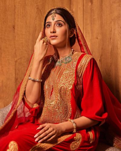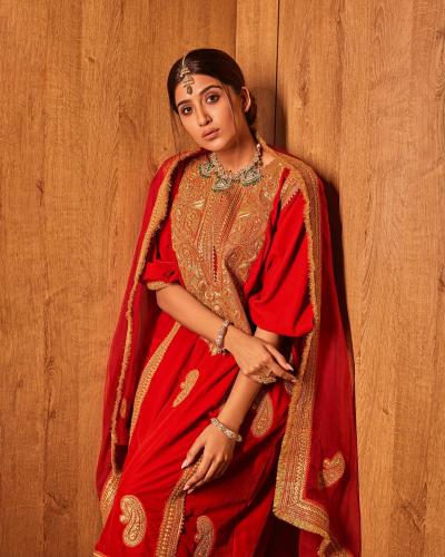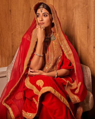 निमृत कौर ने गोल्डन कलर की एंब्रॉयडरी वाला लाल रंग का सूट पहना है, इसके साथ बैंगल्स, नेकलेस और मांगटीका से पूरा किया हैं। (फोटो: इंस्टाग्राम)