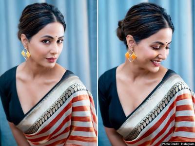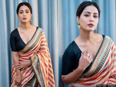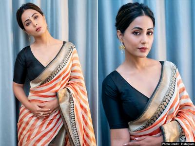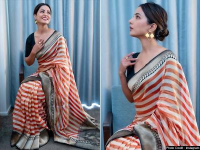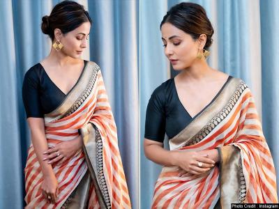 हिना इस दौरान ब्लैक कलर के ब्लाउस के साथ नारंगी और ऑफ वाईट रंग की साड़ी में काफी गॉर्जियस दिख रही हैं।
