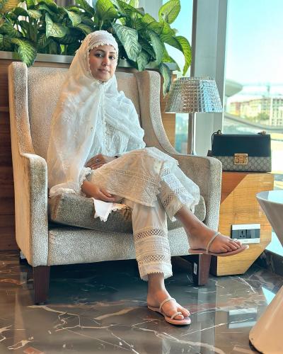 इन तस्वीरों में हिना ने सफेद रंग का सलवार सूट और सिर पर हिजाब पहना हुआ हैं। (फोटो: इंस्टाग्राम)
