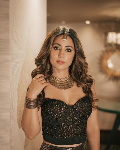 हिना खान ब्लैक ड्रेस के साथ माथे पर मांग टीका और गले में गोल्डन नेकलेस पहने हुए हैं। (फोटो: इंस्टाग्राम)