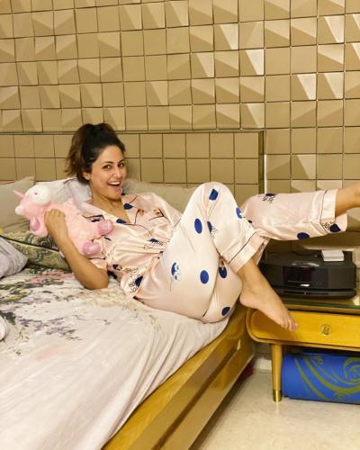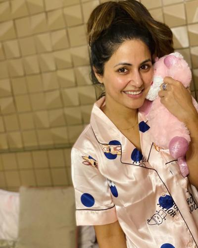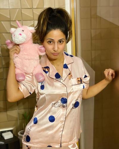 इन फोटोज में हिना नाइट सूट पहने नजर आ रही हैं, साथ ही एक्ट्रेस मे हाथ में एक टेडीबियर ले रखा है
