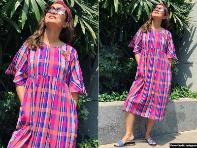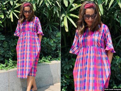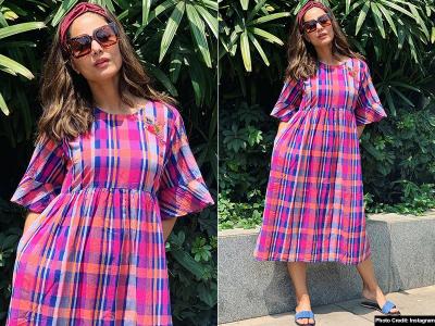 अब इसके बाद हिना ने एक फिर कलरफुल पिंक कलर की ड्रेस में एक साथ कई तस्वीरें फैंस के साथ साझा की हैं।