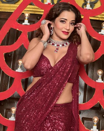मोनालिसा ने मैरून कलर की शिमरी साड़ी पहने हुए हैं, इसके साथ मैचिंग कलर का डीप नेक ब्लाउज वियर किया। (फोटो: इंस्टाग्राम)