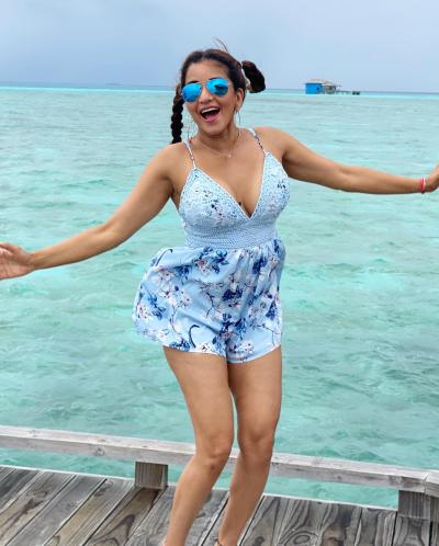 इन तस्वीरों में मोनालिसा ब्लू कलर के डीप नेक शॉर्ट ड्रेस पहने नजर आ रही हैं। (फोटो: इंस्टाग्राम)