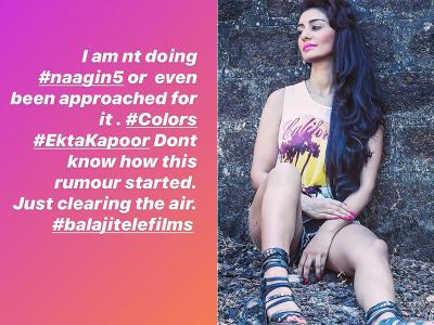 इसमें उन्होंने लिखा हुआ है की, 'मैं नागिन 5 नहीं कर रही हूं और इसके लिए मुझ से कोई संपर्क नही किया गया है'। (फोटो: इंस्टाग्राम)