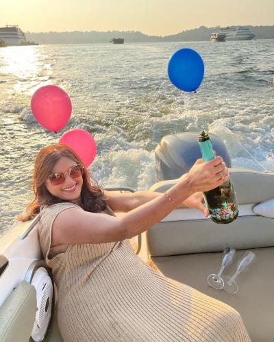 अभिनेत्री की माँ उषा शर्मा अपने जन्मदिन पर शैंपेन पीते हुए मुस्कुराती हैं। (फोटो: इंस्टाग्राम)