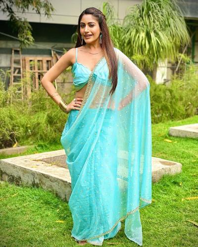 टीवी की फेमस एक्ट्रेस सुरभि चंदना ने ब्लू ट्रांसपेरेंट साड़ी में अपनी फोटोज शेयर की हैं। (फोटो: इंस्टाग्राम)