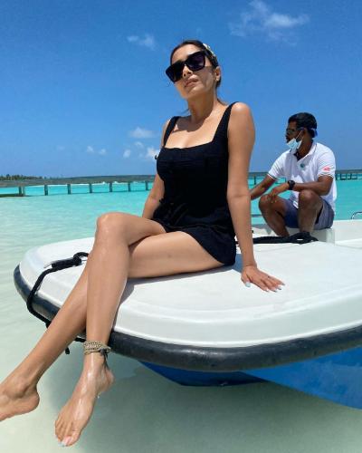 हाल ही में टीना दत्ता ने पीली और सफेद धारियों वाला स्विमसूट पहने हुए कुछ फोटोज शेयर की हैं। (फोटो: इंस्टाग्राम)