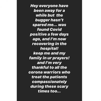 श्रेनू ने लिखा- कुछ दिनों पहले मैं कोरोना पॉजिटिव पाई गई, अब मैं हॉस्पिटल में रिकवर कर रही हूं। मुझे और मेरे परिवार को अपनी प्रार्थना में रखिए, मैं कोरोना वॉरियर्स की शुक्रगुजार हूं, जो इस डरावने समय में मरीजों का इलाज कर रहे हैं।