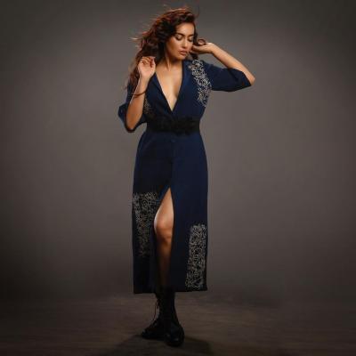 सुरभि की इस ब्लू ड्रेस पर वाइट थ्रेड से डिजाइन्स बनाई गई थीं।