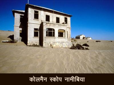 कोलमैन स्कोप नामीबिया: 20 वीं शताब्दी में यह बसा यह कोलमैन स्कोप शहर नामीब मरुस्थल में 1950 के बाद से वीरान पड़ा है।