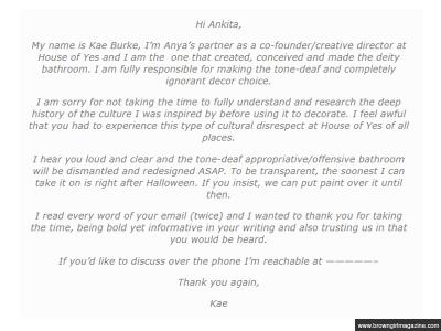 हाउस ऑफ येस पब की तरफ से अंकिता को किया गया रिप्लाई।