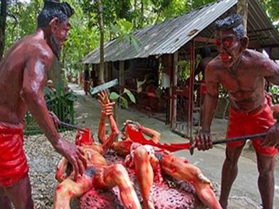 इस मंदिर में सभी मूर्तियों को लाल रंग के पेंट से रंगा हुआ है, जिससे इस बात का एहसास होने लगता है कि आप किसी मंदिर में नहीं बल्कि साक्षात नर्क में प्रवेश कर चुके हैं।